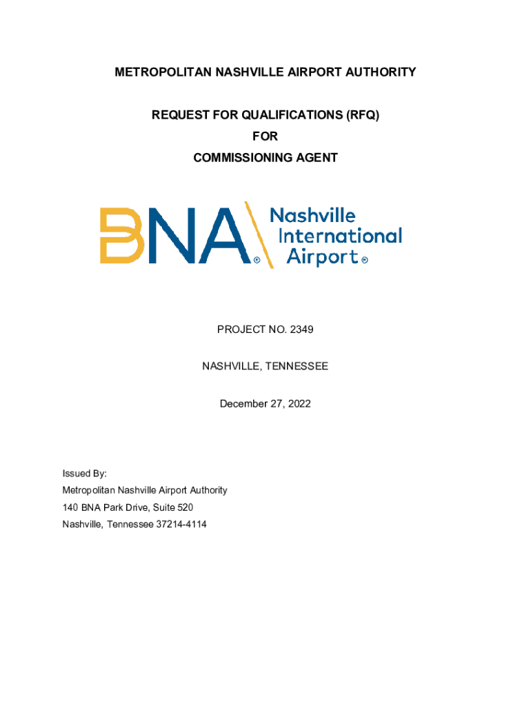 METROPOLITAN NASHVILLE AIRPORT AUTHORITYREQUEST FOR QUALIFICATIONS (RFQ) FOR COMMISSIONING AGENTPROJECT NO. 2349 NASHVILLE, TENNESSEE December 27, 2022Issued By: Metropolitan Nashville Airport Authority