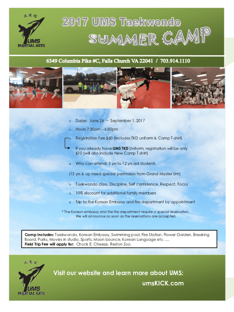 Dates: June 26 September 1. 2017oHours 7:30am 6:30pmoRegistration Fee $60 (Includes TKD uniform & Camp Shirt) If you already have UMS TKD Uniform, registration will be only $10 (will also include