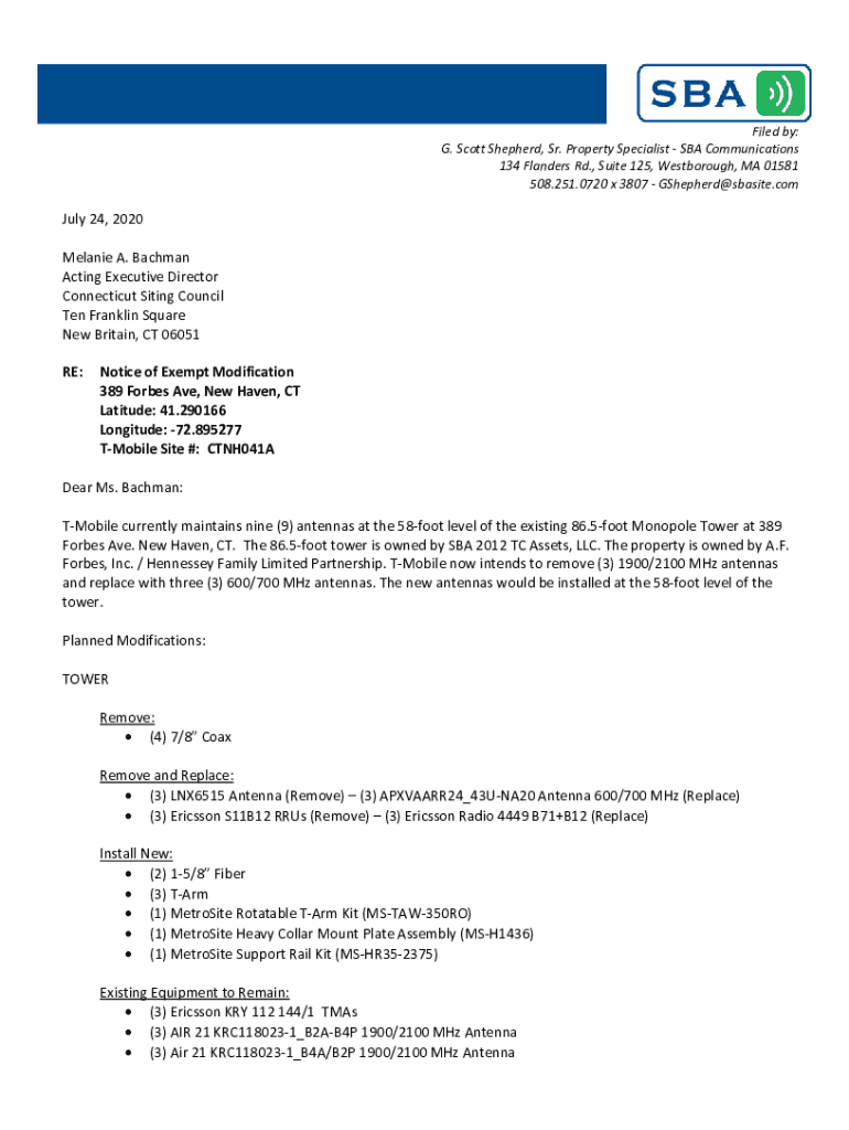Filed by: G. Scott Shepherd, Sr. Property Specialist SBA Communications 134 Flanders Rd., Suite 125, West borough, MA 01581 508.251.0720 × 3807 GShepherd@sbasite.comJuly 24, 2020 Melanie A. Bach