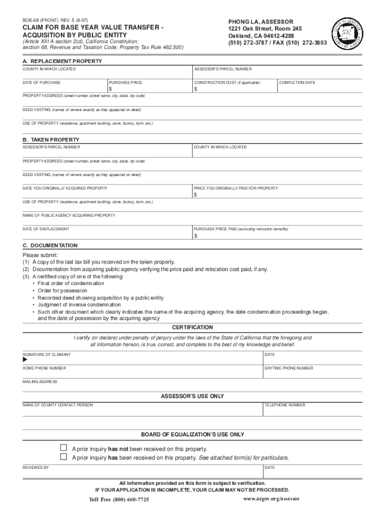 This is a Fill in Form. Fill in and Print. Print Form Clear FormOFFICE OF ASSESSOR COUNTY OF ALAMEDA 1221 Oak St., Room 145, County Administration Building Oakland, California 946124288 (510) 2723787