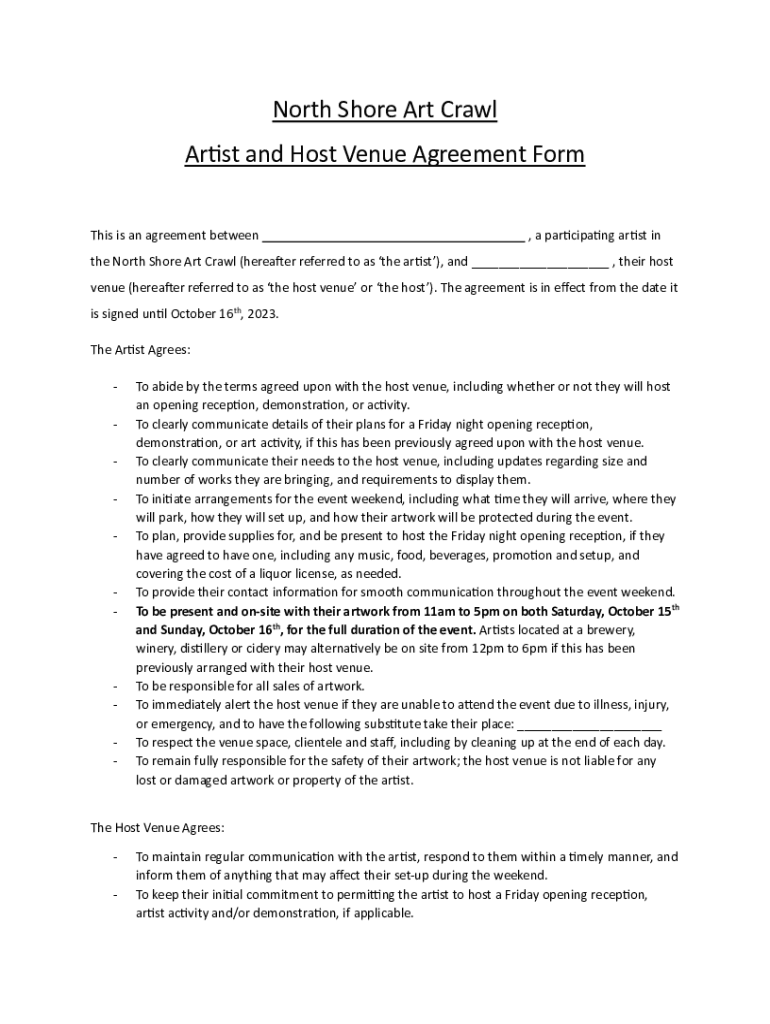 Get the free North Shore Art Crawl Ar st and Host Venue Agreement ...