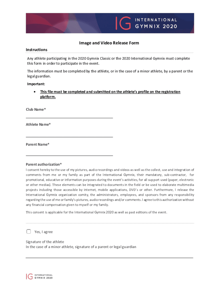 Image and Video Release Form Instructions Any athlete participating in the 2020 Gym nix Classic or the 2020 International Gym nix must complete this form in order to participate in the event. The