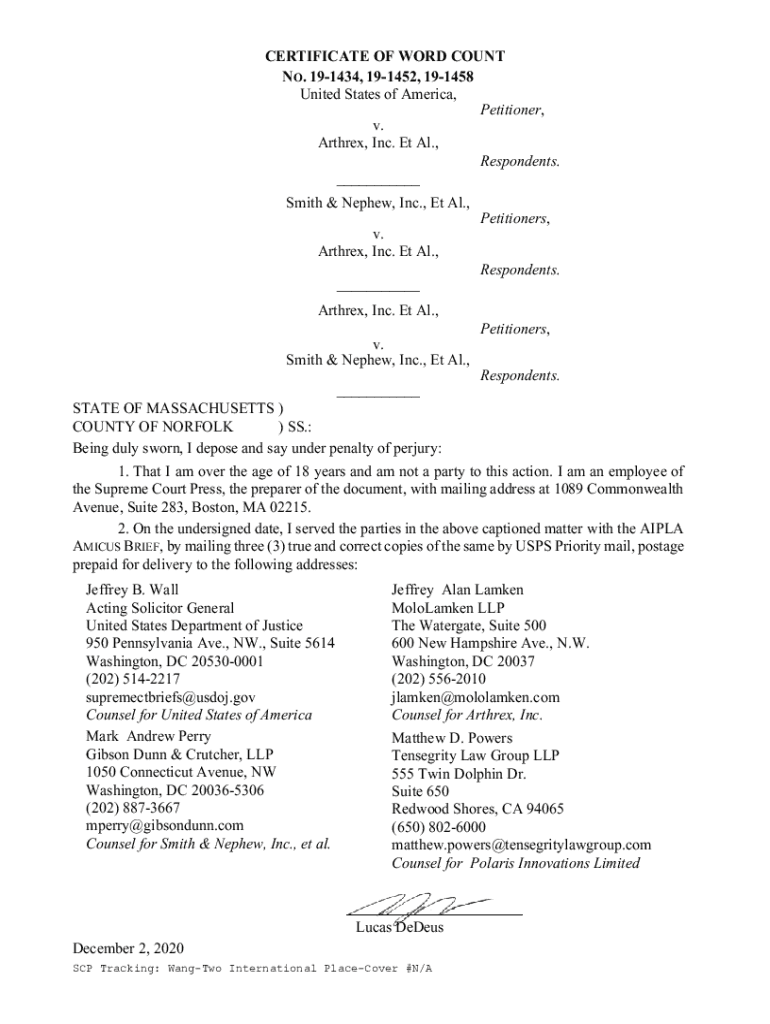CERTIFICATE OF WORD COUNT NO. 191434, 191452, 191458 United States of America, Petitioner, v. Anthrax, Inc. Et Al., Respondents. ___ Smith & Nephew, Inc., Et Al., v. Anthrax, Inc. Et Al., ___Petitioners,