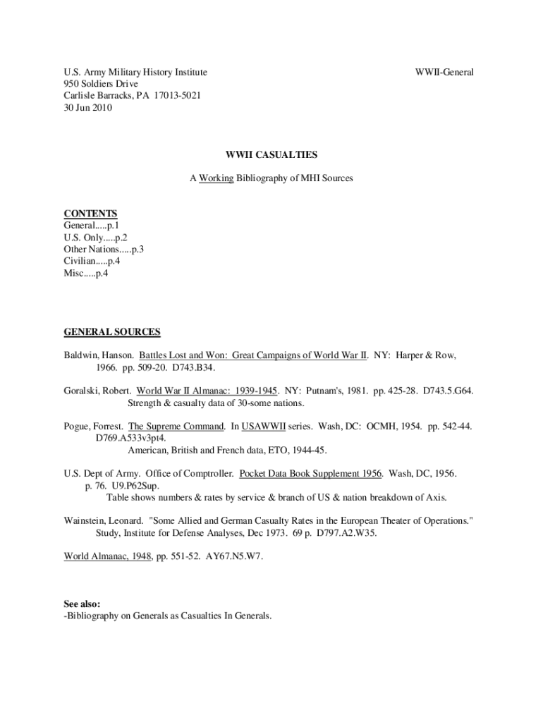 U.S. Army Military History Institute 950 Soldiers Drive Carlisle Barracks, PA 170135021 30 Jun 2010WWIIGeneralWWII CASUALTIES A Working Bibliography of MRI SourcesCONTENTS General.....p.1 U.S. Only.....p.2