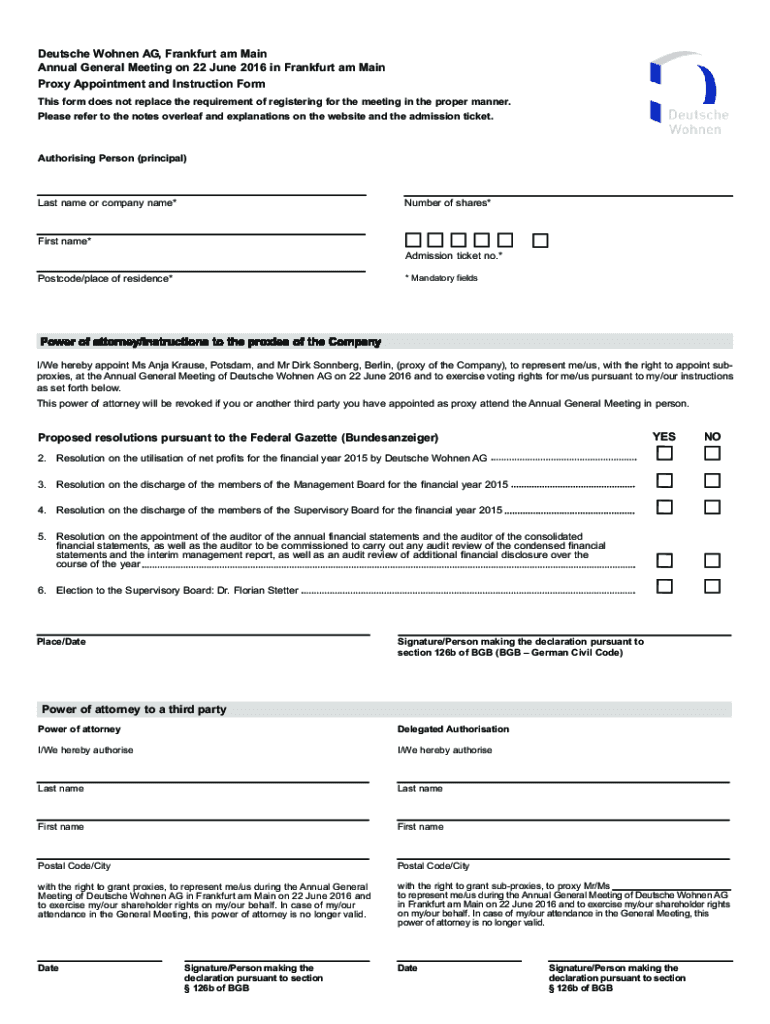 Shareholders who are unable to attend a company's annual general meeting in person are required to file deutsche wohnen - proxy in order to authorize someone else to vote on their behalf.