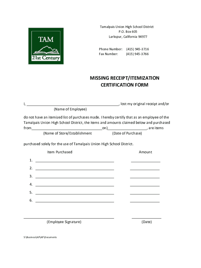 Tamales Union High School District P.O. Box 605 Larkspur, California 94977 Phone Number: Fax Number:(415) 9453716 (415) 9453766MISSING RECEIPT/ITEMIZATION CERTIFICATION FORM, ___, lost my original