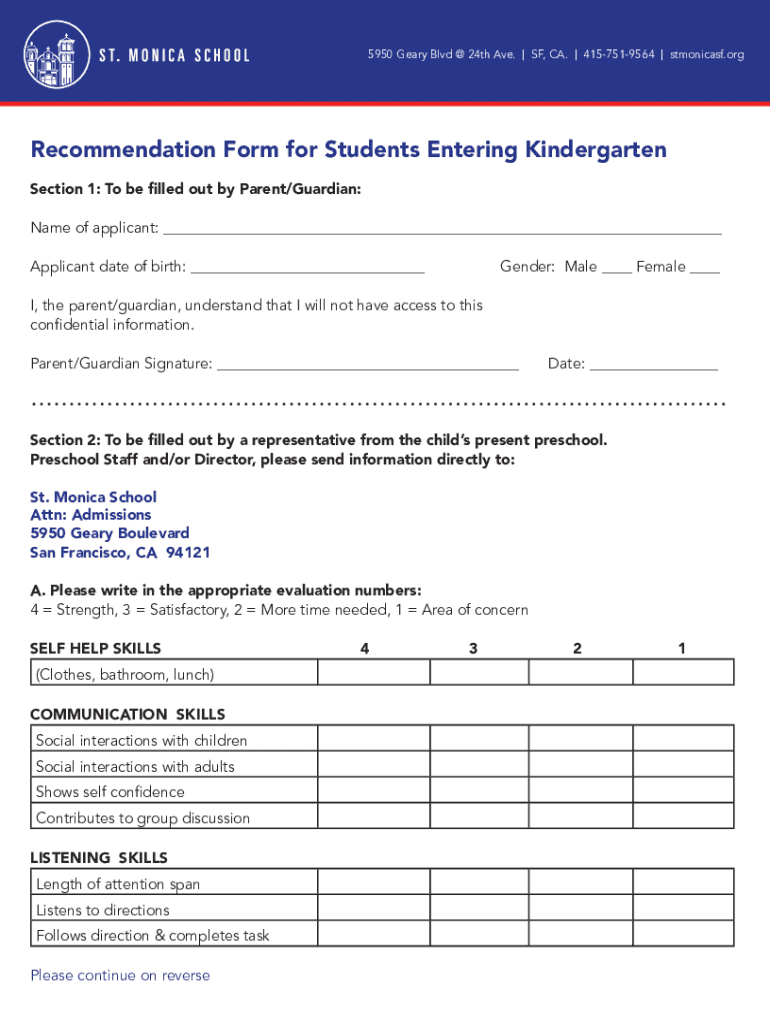 5950 Gear Blvd @ 24th Ave.| SF, CA. | 4157519564 | stmonicasf. Recommendation Form for Students Entering Kindergarten Section 1: To be filled out by Parent/Guardian: Name of applicant: ___ Applicant