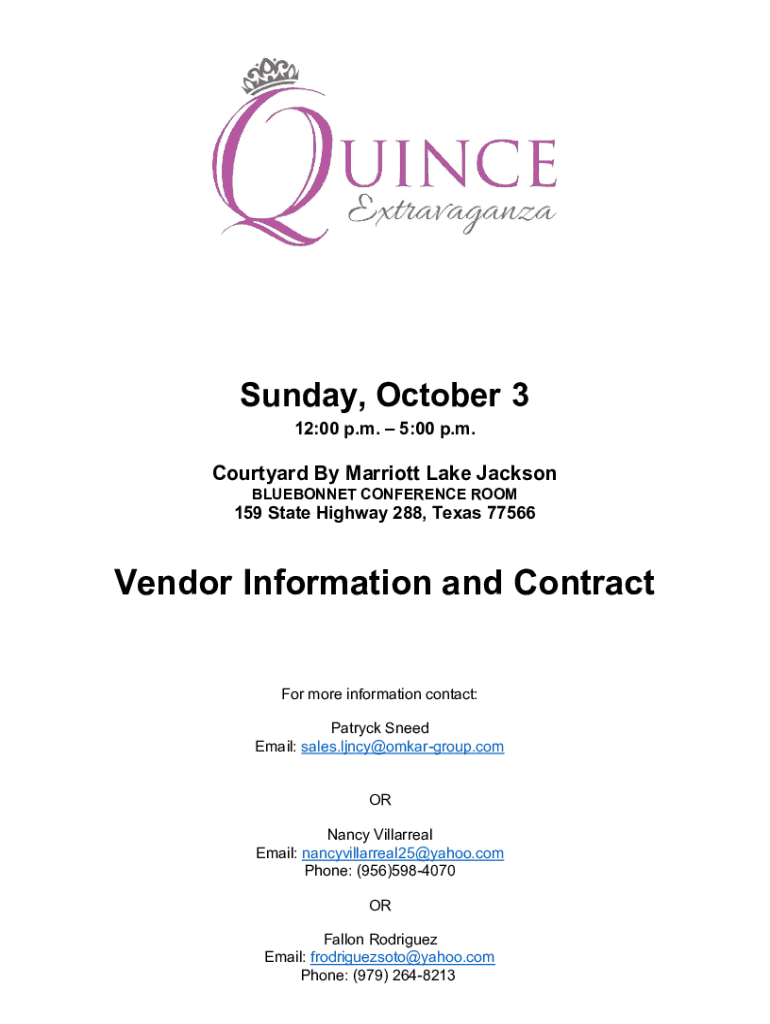 Sunday, October 3 12:00 p.m. 5:00 p.m. Courtyard By Marriott Lake Jackson BLUEBONNET CONFERENCE ROOM159 State Highway 288, Texas 77566Vendor Information and Contract For more information contact:
