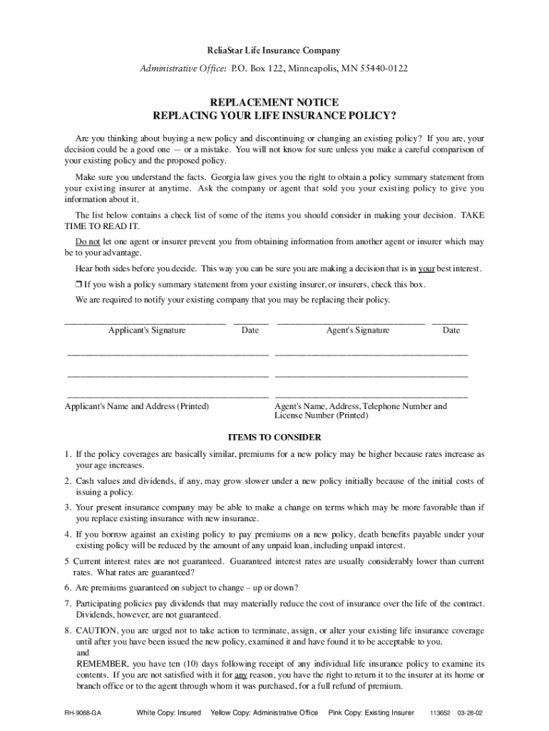 Register Life Insurance Company Administrative Office: P.O. Box 122, Minneapolis, MN 554400122REPLACEMENT NOTICE REPLACING YOUR LIFE INSURANCE POLICY? Are you thinking about buying a new policy and