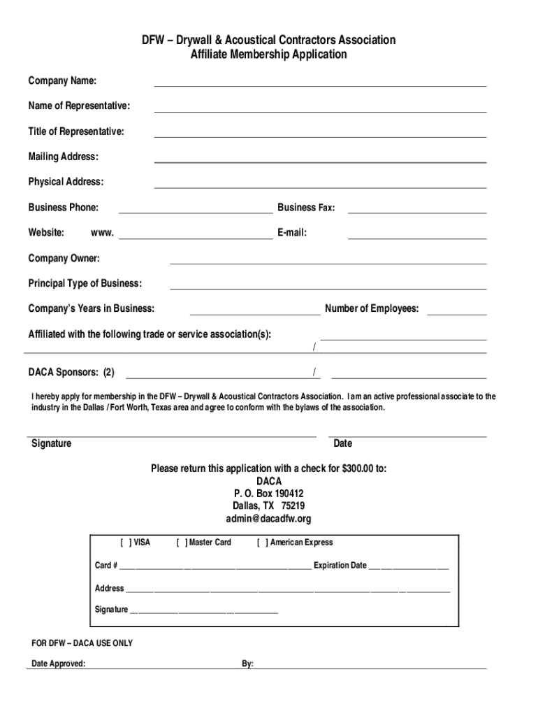 DFW Drywall & Acoustical Contractors Association Affiliate Membership Application Company Name: Name of Representative: Title of Representative: Mailing Address: Physical Address: Business Phone:Business