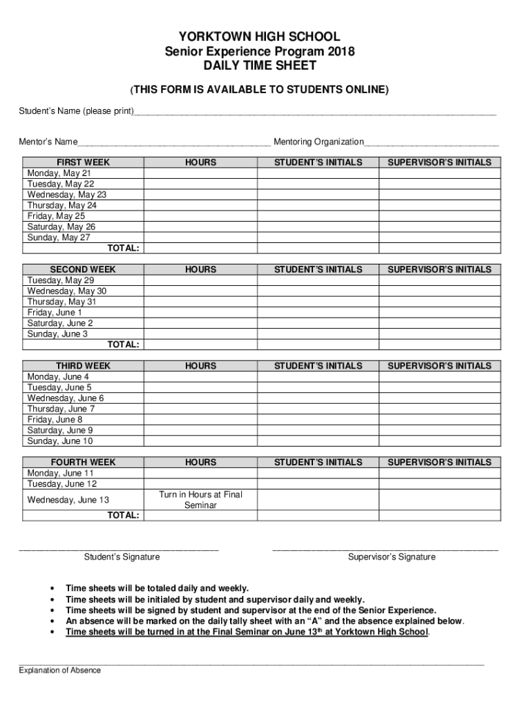 YORKTOWN HIGH SCHOOL Senior Experience Program 2018 DAILY TIME SHEET (HISTORY IS AVAILABLE TO STUDENTS ONLINE)Students Name (please print)___ Mentors Name___ Mentoring Organization___ FIRST WEEK Monday,