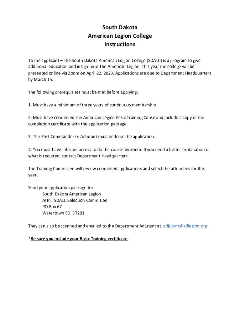 South Dakota American Legion College Instructions To the applicant The South Dakota American Legion College (SDLC) is a program to give additional education and insight into The American Legion. This
