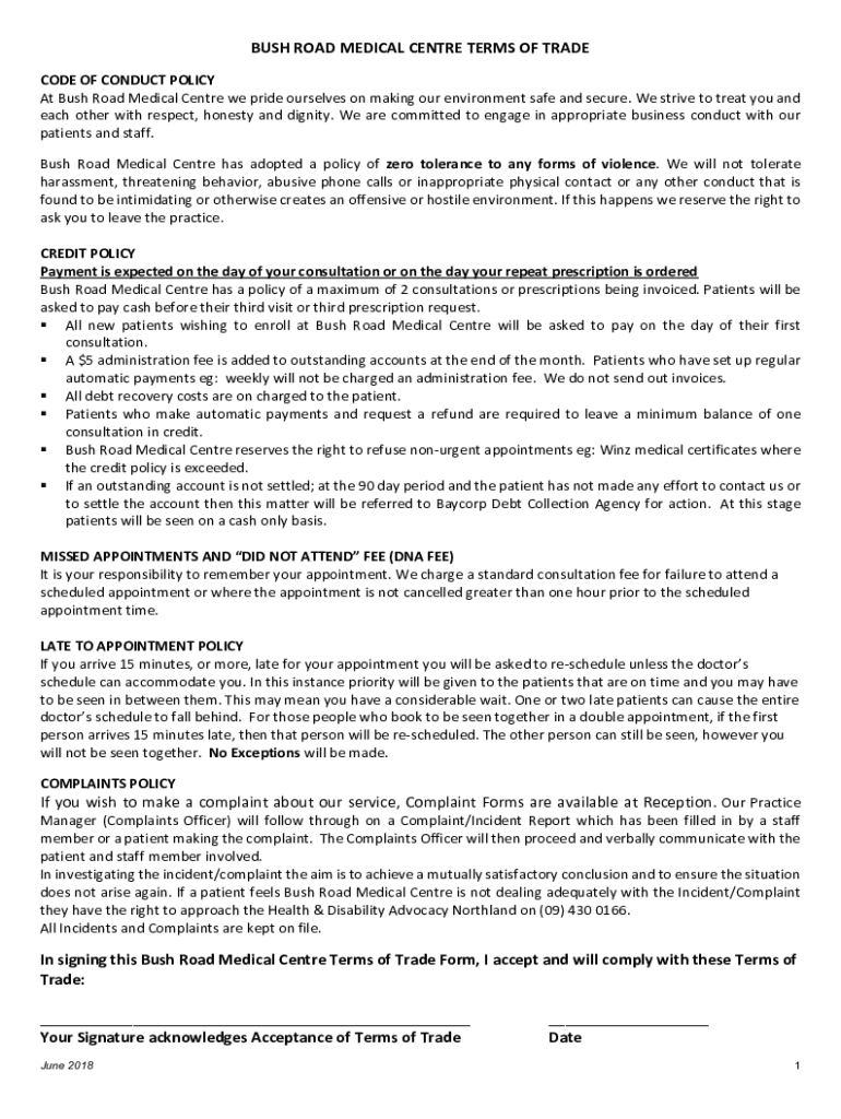 Get the free Bush Road Medical Centre Terms of Trade - bushroad.co.nz
