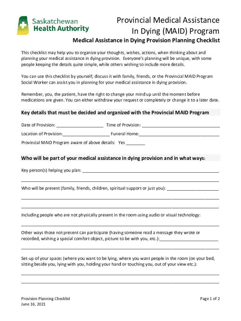Provincial Medical Assistance In Dying (MAID) Program Medical Assistance in Dying Provision Planning Checklist This checklist may help you to organize your thoughts, wishes, actions, when thinking