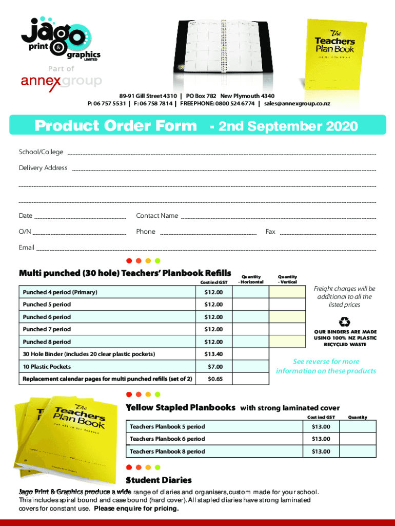 8991 Gill Street 4310 | PO Box 782 New Plymouth 4340 P: 06 757 5531 | F: 06 758 7814 | FREEPHONE: 0800 524 6774 | sales@annexgroup.co.nzProduct Order Form 2nd September 2020 School/College Delivery