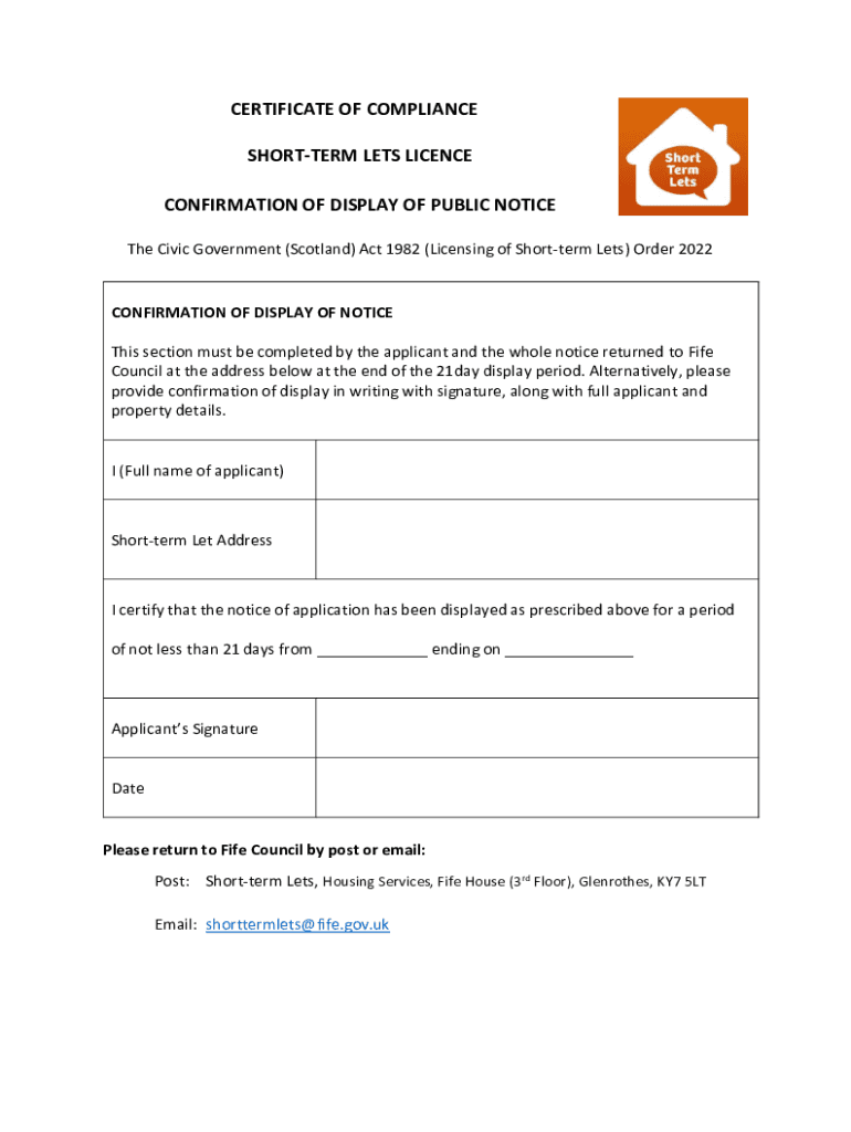 CERTIFICATE OF COMPLIANCE SHORTER LETS License CONFIRMATION OF DISPLAY OF PUBLIC NOTICE The Civic Government (Scotland) Act 1982 (Licensing of Short term Lets) Order 2022CONFIRMATION OF DISPLAY OF
