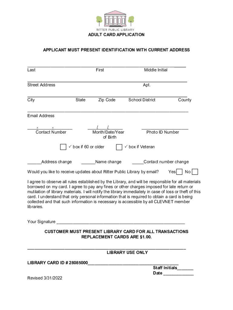 ADULT CARD APPLICATION APPLICANT MUST PRESENT IDENTIFICATION WITH CURRENT ADDRESS ___ Last First Middle Initial ___ ___ Street Address Apt. ___ ___ City State Zip Code School District County ___ Email