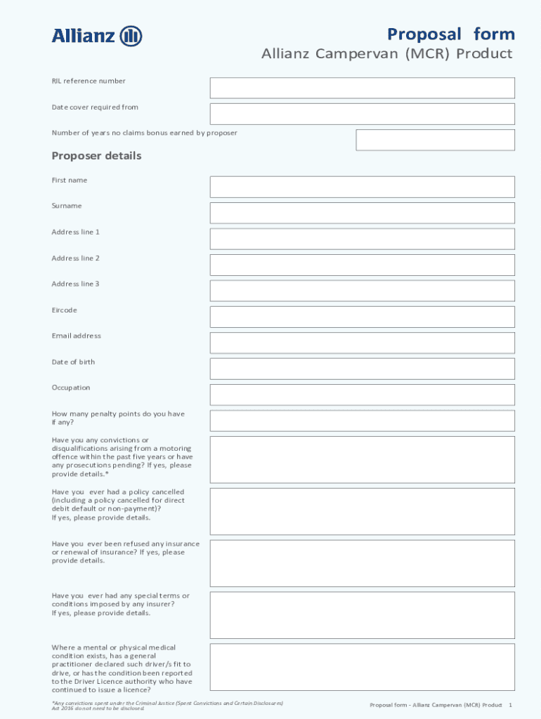 Proposal form Allianz Camper van (MCR) Product OIL reference number Date cover required from Number of years no claims' bonus earned by proposerProposer details First name Surname Address line 1 Address