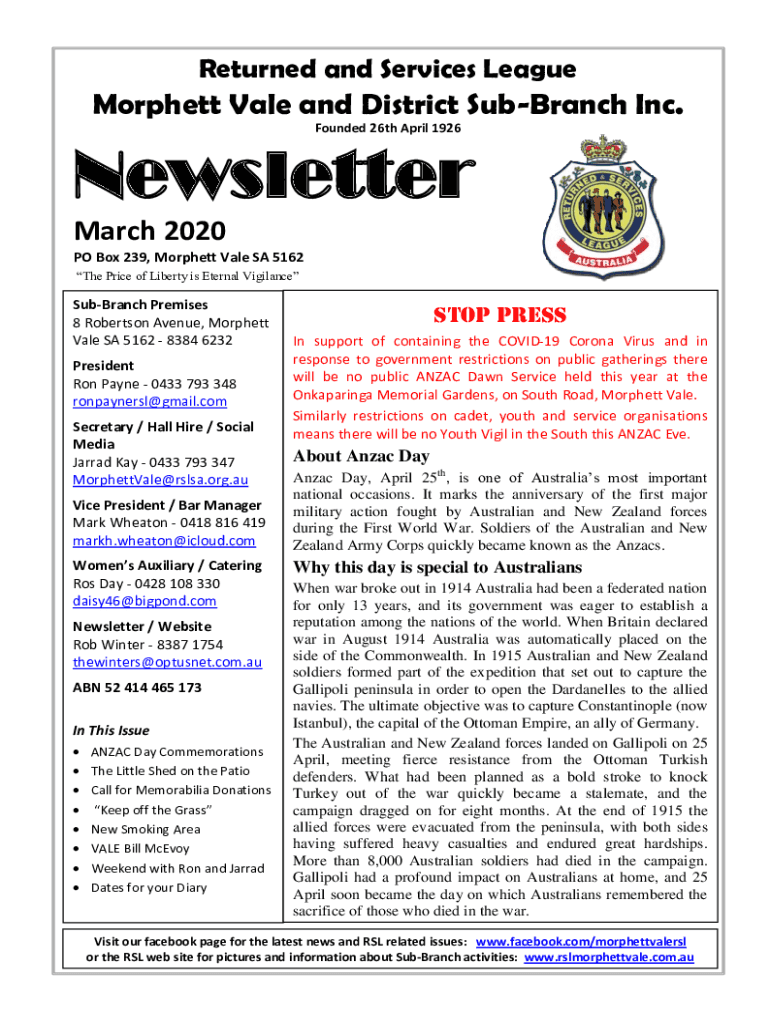 Returned and Services LeagueMorphett Vale and District Subbranch Inc. Founded 26th April 1926Newsletter March 2020 PO Box 239, Forfeit Vale SA 5162 The Price of Liberty is Eternal VigilanceSubBranch