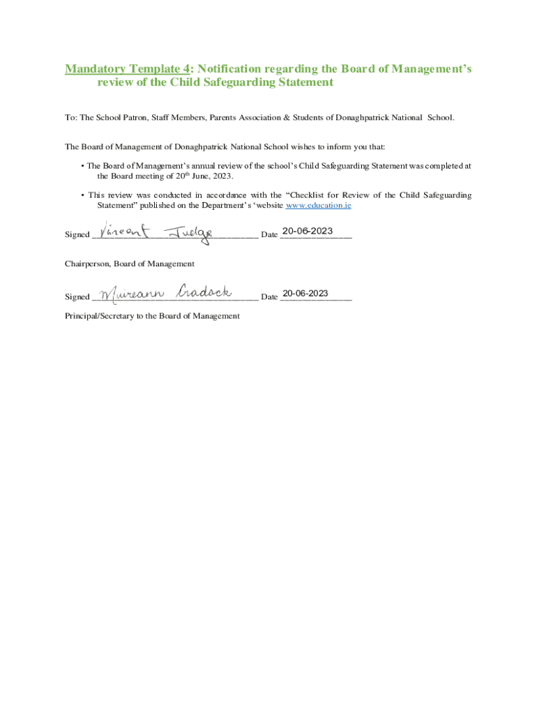 Mandatory Template 4: Notification regarding the Board of Managements review of the Child Safeguarding Statement To: The School Patron, Staff Members, Parents Association & Students of Donaghpatrick