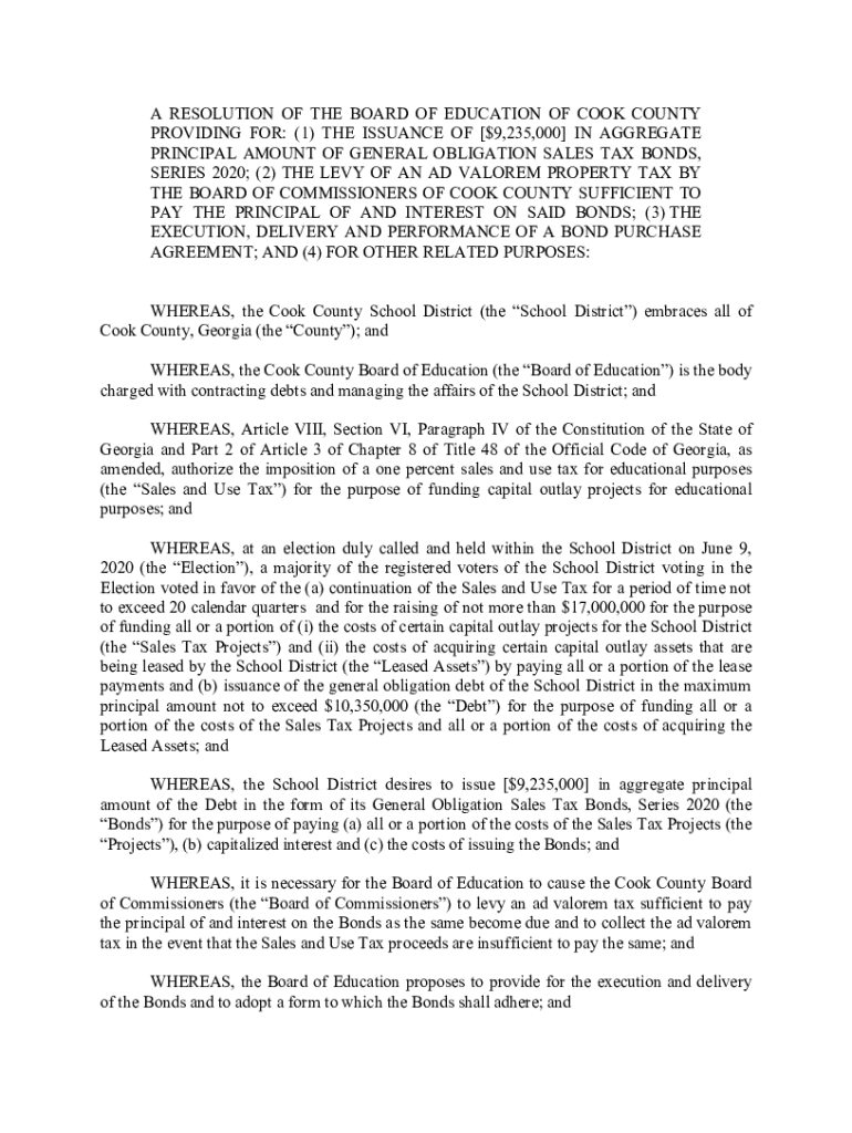 A RESOLUTION OF THE BOARD OF EDUCATION OF COOK COUNTY PROVIDING FOR: (1) THE ISSUANCE OF [$9,235,000] IN AGGREGATE PRINCIPAL AMOUNT OF GENERAL OBLIGATION SALES TAX BONDS, SERIES 2020; (2) THE LEVY