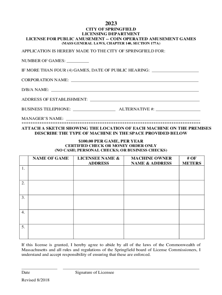 2023 CITY OF SPRINGFIELD LICENSING DEPARTMENT LICENSE FOR PUBLIC AMUSEMENT COIN OPERATED AMUSEMENT GAMES (MASS GENERAL LAWS, CHAPTER 140, SECTION 177A)APPLICATION IS HEREBY MADE TO THE CITY OF SPRINGFIELD