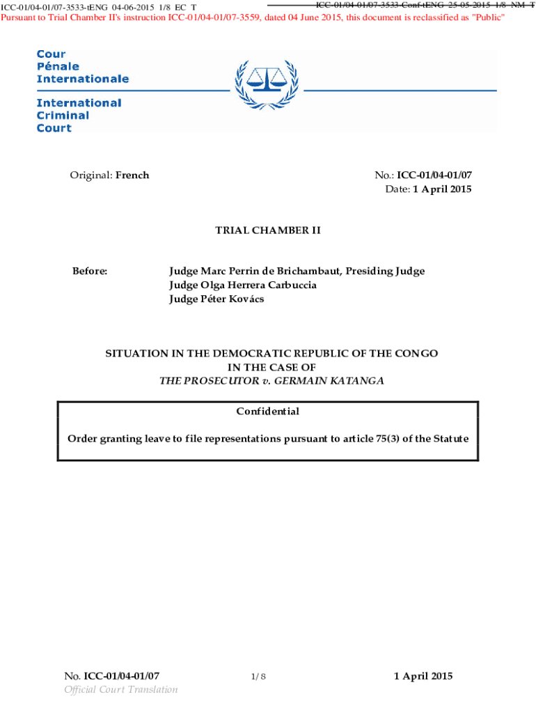 Get the free Pursuant to Trial Chamber II's instruction ICC-01/04-01/07-3559, dated 04 June 2015,...