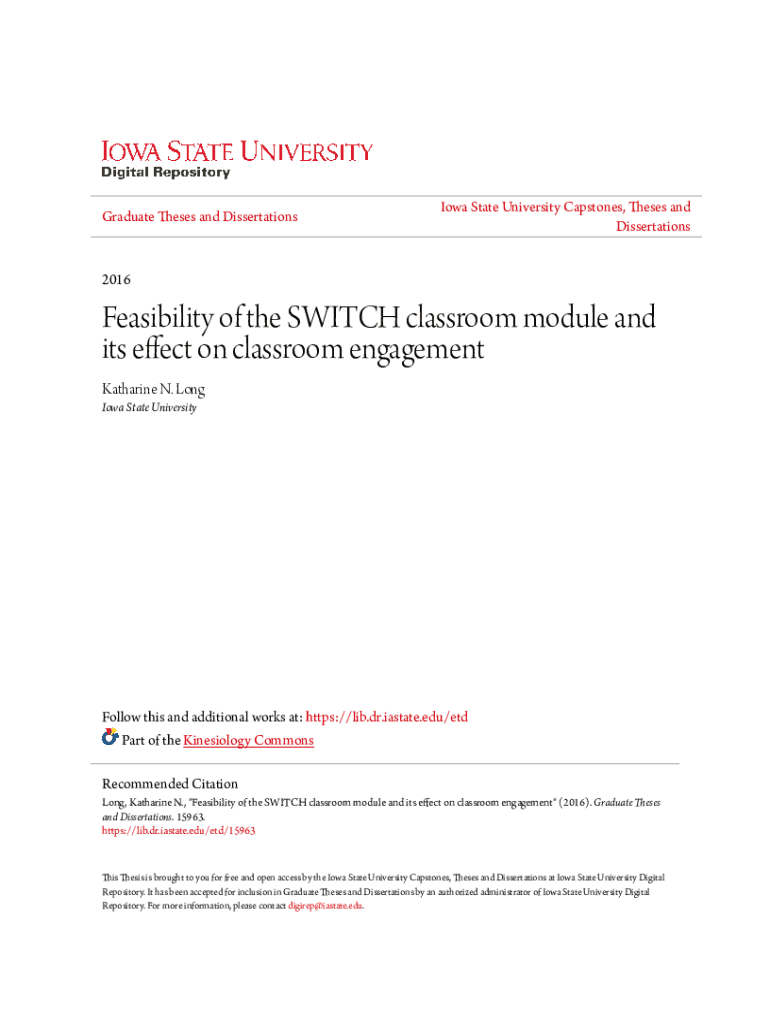 Graduate Theses and Dissertations Iowa State University Capstones, Theses and Dissertations2016Feasibility of the SWITCH classroom module and its effect on classroom engagement Katharine N. Long Iowa