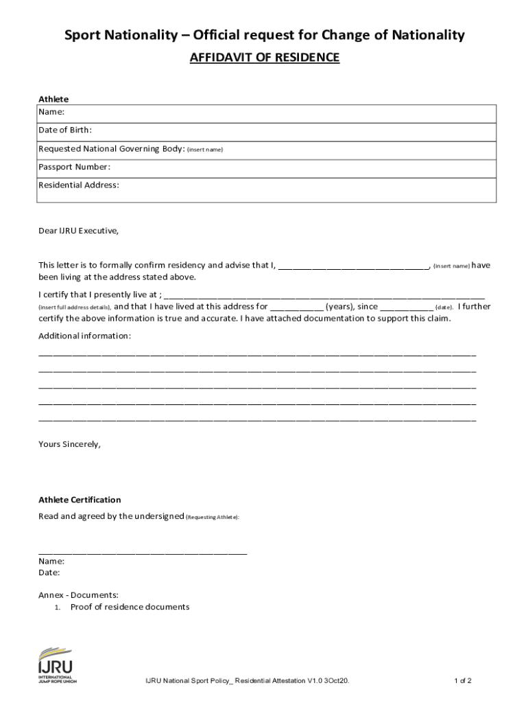 Sport Nationality Official request for Change of Nationality AFFIDAVIT OF RESIDENCE Athlete Name: Date of Birth: Requested National Governing Body: (insert name) Passport Number: Residential Address:Dear