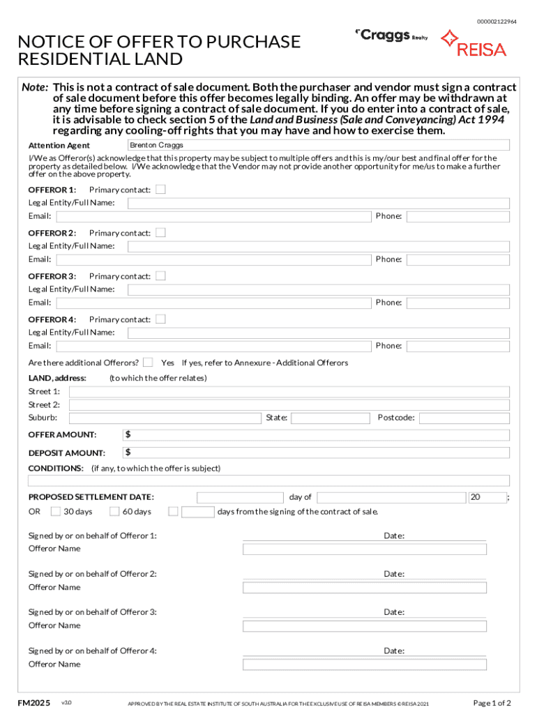 000002122964NOTICE OF OFFER TO PURCHASE RESIDENTIAL LAND Note: This is not a contract of sale document. Both the purchaser and vendor must sign a contract of sale document before this offer becomes