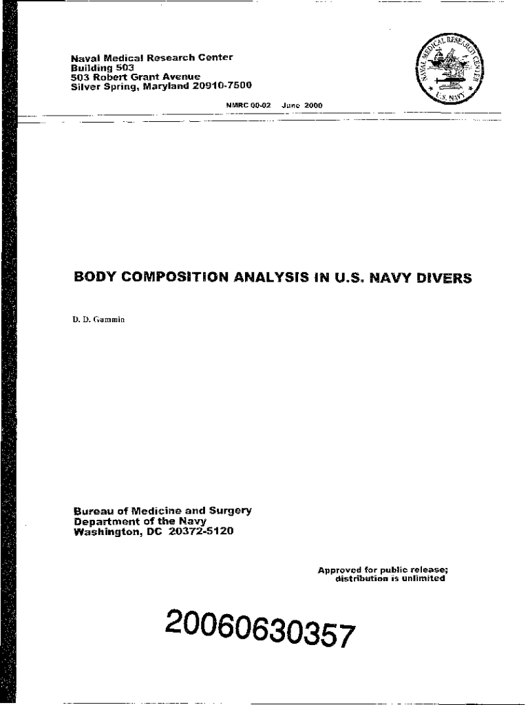 Naval Medical Research Center Building 503 503 Robert Grant Avenue Silver Spring, Maryland 209107500 NMR 0002June 2000BODY COMPOSITION ANALYSIS IN U.S. NAVY DIVERS D. D. GumminBureau of Medicine and