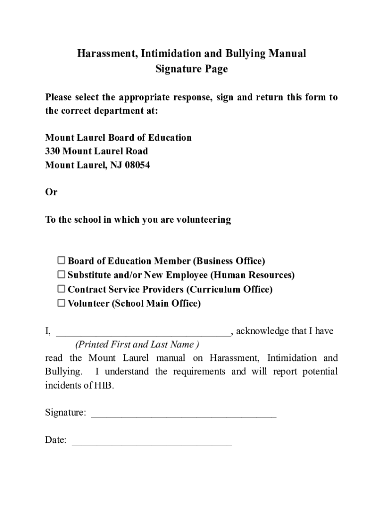 Harassment, Intimidation and Bullying Manual Signature Page Please select the appropriate response, sign and return this form to the correct department at: Mount Laurel Board of Education 330 Mount