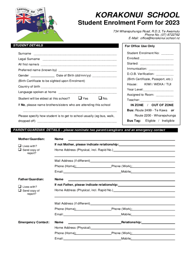 Parents or guardians of students attending Korakonui School are required to file information related to the student.