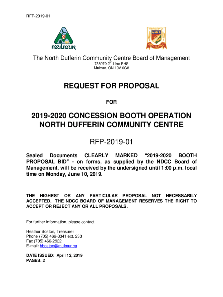 RFP201901The North Duffer in Community Center Board of Management 758070 2 Line EHS Murmur, ON L9V 0G8REQUEST FOR PROPOSAL FOR20192020 CONCESSION BOOTH OPERATION NORTH DUFFER IN COMMUNITY Center RFP201901