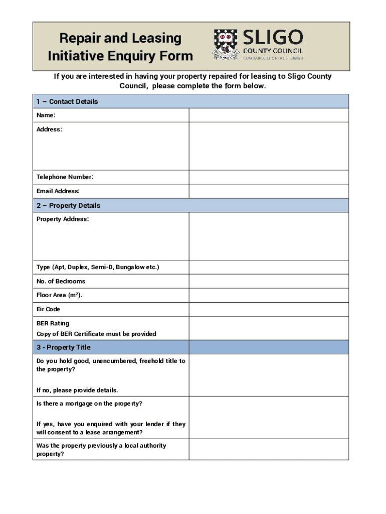 Repair and Leasing Initiative Inquiry Form If you are interested in having your property repaired for leasing to LIGO County Council, please complete the form below. 1 Contact Details Name: Address:Telephone
