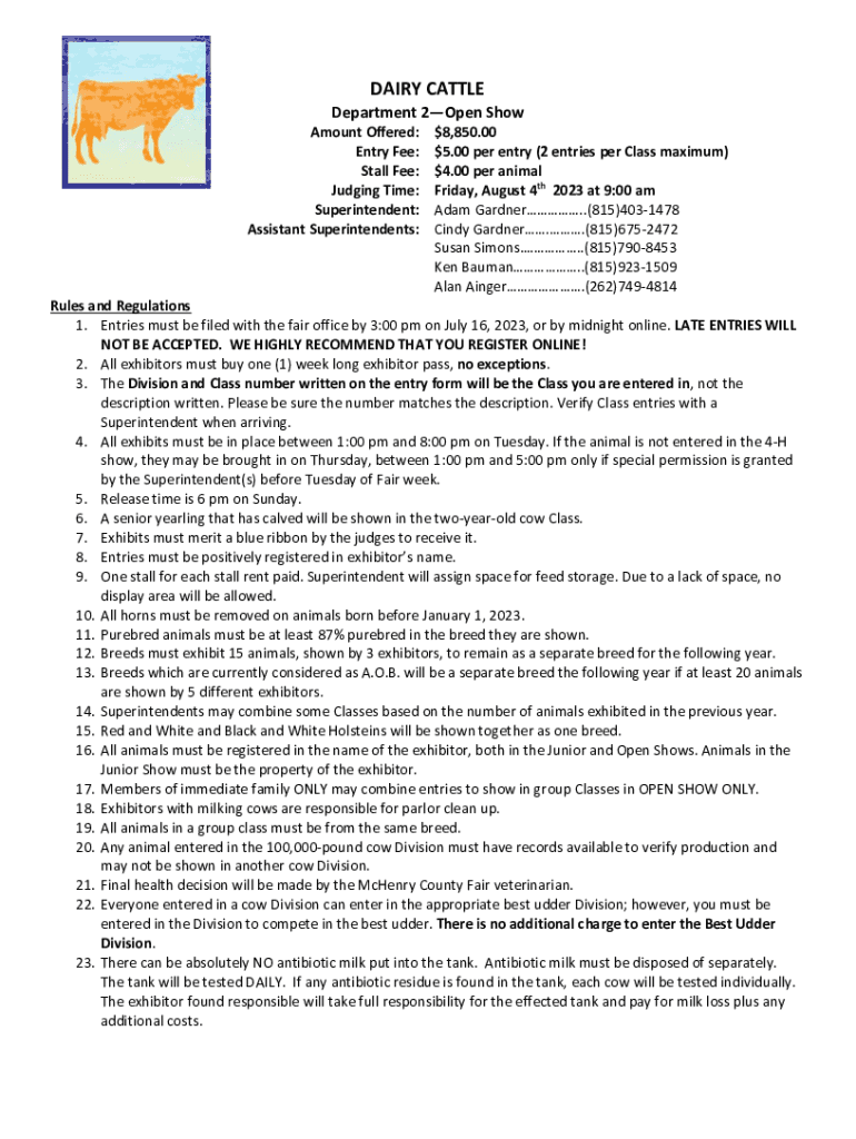 DAIRY CATTLE Department 2Open Show Amount Offered: Entry Fee: Stall Fee: Judging Time: Superintendent: Assistant Superintendents:$$8,850.005.00 per entry (2 entries per Class maximum) $4.00 per animal