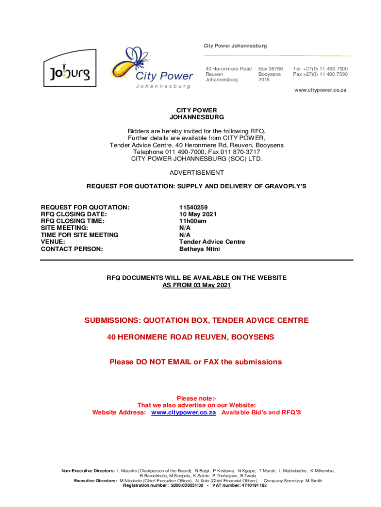 City Power Johannesburg40 Heron mere Road PO B Box 38766 Reuben Loosens Johannesburg 2016Tel +27(0) 11 490 7000 Fax +27(0) 11 490 7590 www.citypower.co.zaCITY POWER JOHANNESBURG Bidders are hereby