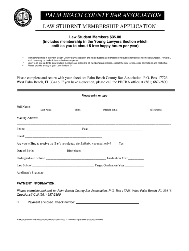PALM BEACH COUNTY BAR ASSOCIATION LAW STUDENT MEMBERSHIP APPLICATION Law Student Members $35.00 (includes membership in the Young Lawyers Section which entitles you to about 5 free happy hours per