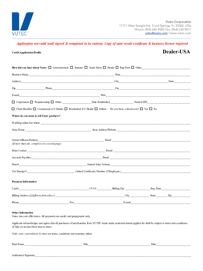 Vote Corporation 11711 West Sample Rd., Coral Springs, FL 33065, USA Phone: (954) 5459000 Fax: (954) 5459011 sales@vutec.com | www.vutec.comApplication not valid until signed & completed in its entirety.