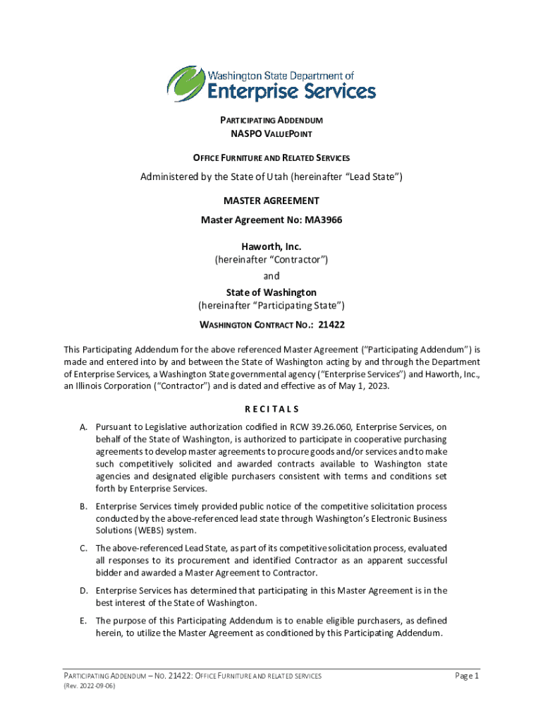 PARTICIPATING ADDENDUM NAS PO BLUEPOINT OFFICE FURNITURE AND RELATED SERVICES Administered by the State of Utah (hereinafter Lead State) MASTER AGREEMENT No: MA3966 Hayworth, Inc. (hereinafter Contractor)