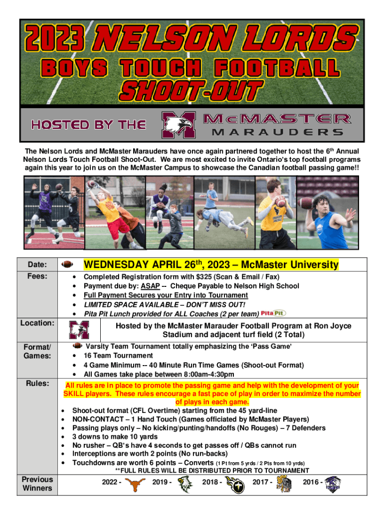 The Nelson Lords and McMaster Marauders have once again partnered together to host the 6th Annual Nelson Lords Touch Football Shootout. We are most excited to invite Ontario stop football programs