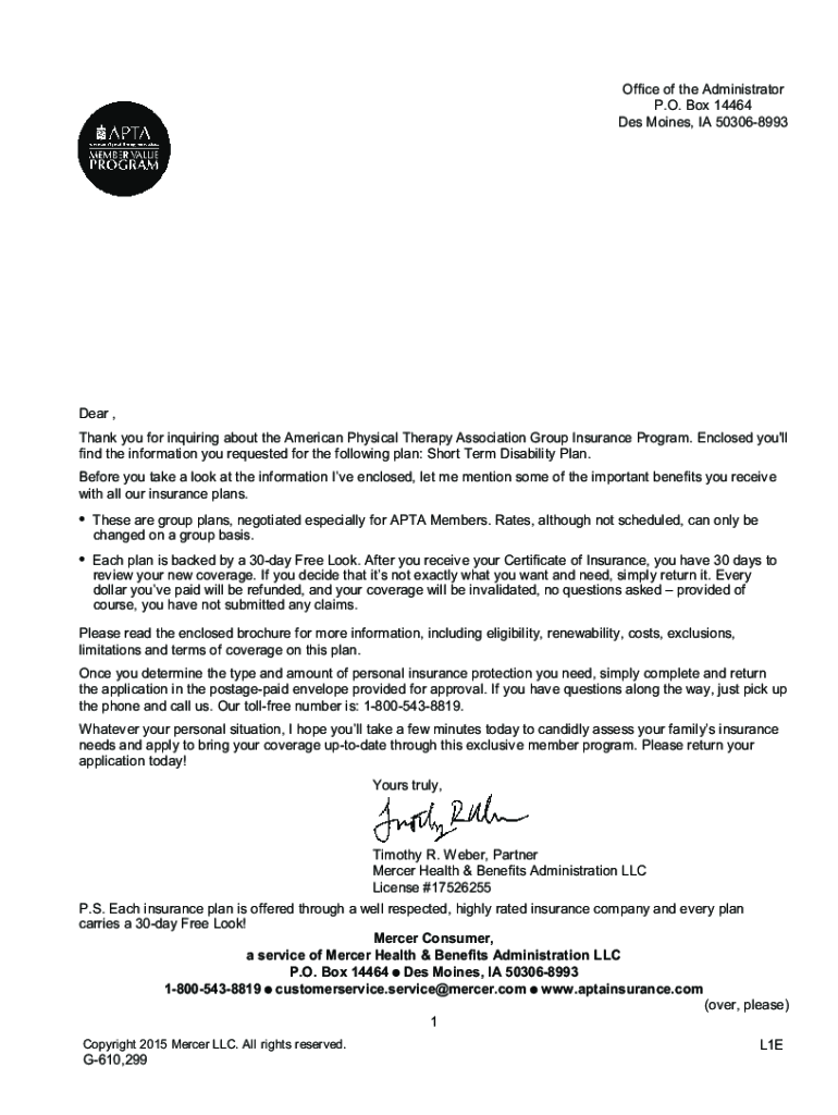 Office of the Administrator P.O. Box 14464 Des Moines, IA 503068993Dear, Thank you for inquiring about the American Physical Therapy Association Group Insurance Program. Enclosed you\'ll find the