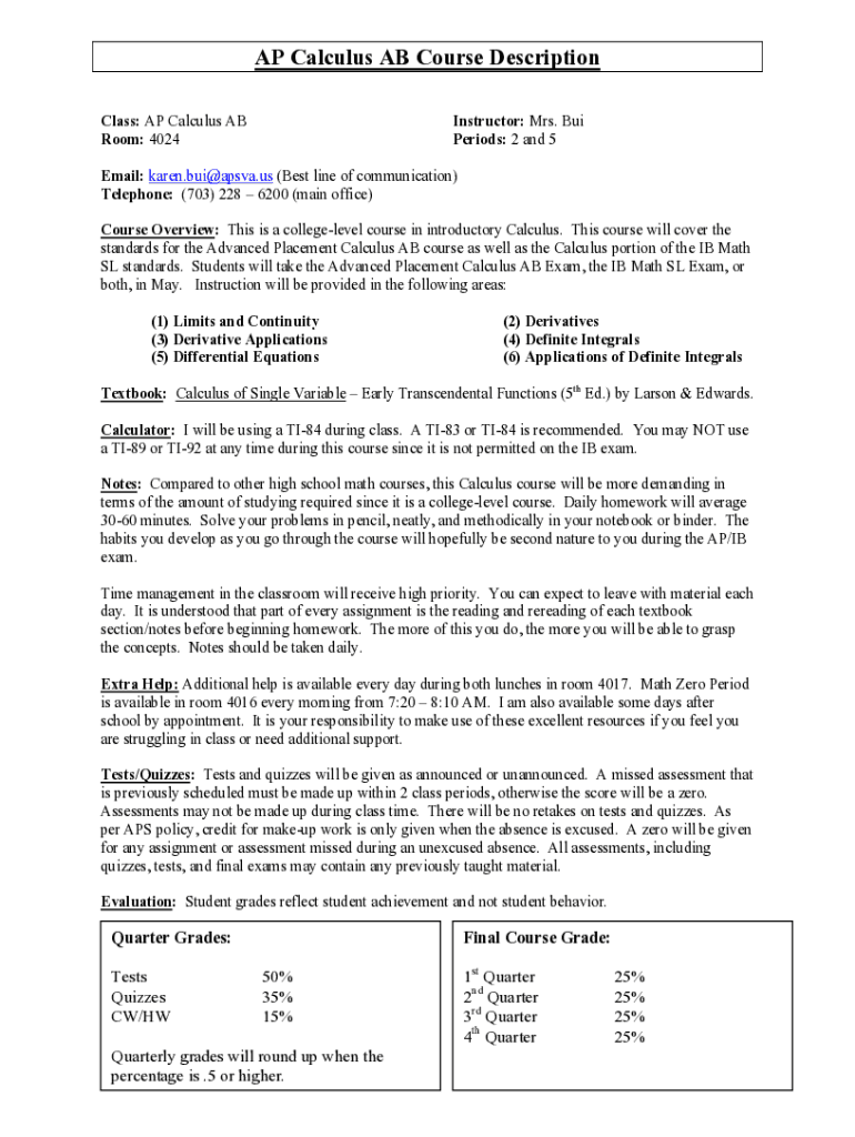 AP Calculus AB Course Description Class: AP Calculus AB Room: 4024Instructor: Mrs. Boo Periods: 2 and 5Email: karen.bui@apsva.us (Best line of communication) Telephone: (703) 228 6200 (main office)