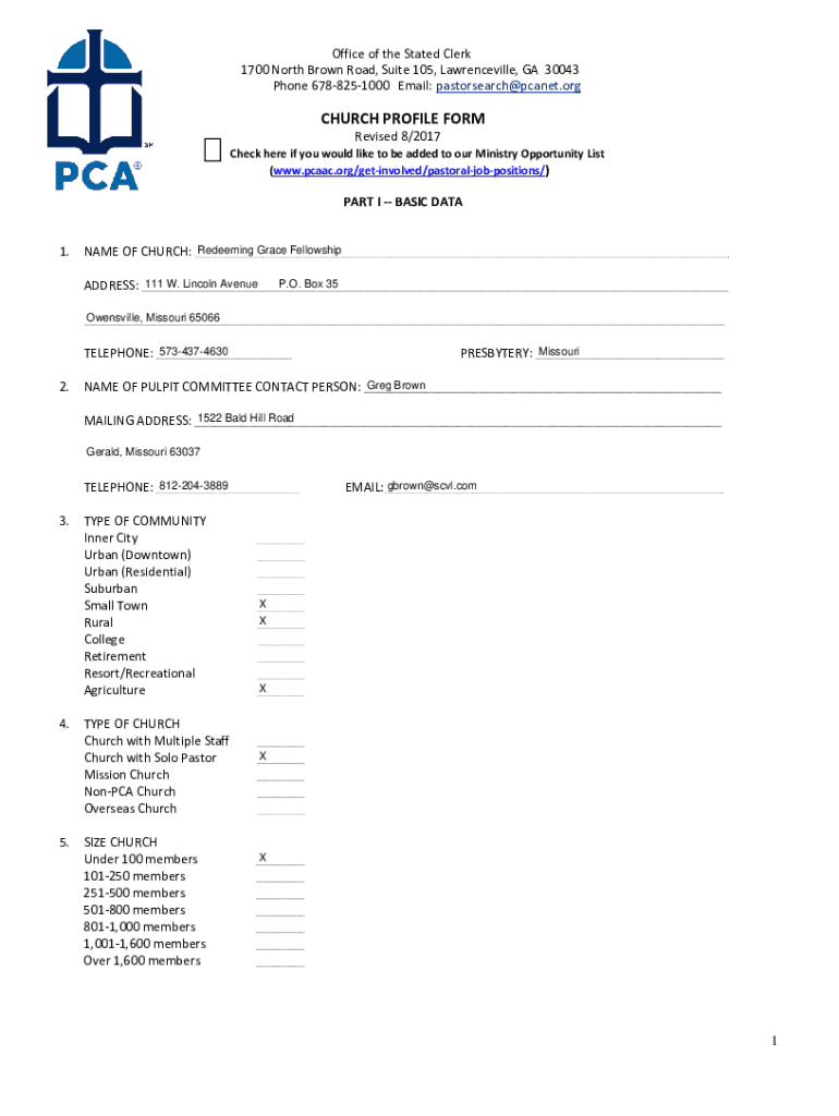 Office of the Stated Clerk 1700 North Brown Road, Suite 105, Lawrenceville, GA 30043 Phone 6788251000 Email: pastorsearch@pcanet.orgCHURCH PROFILE FORM Revised 8/2017Check here if you would like to
