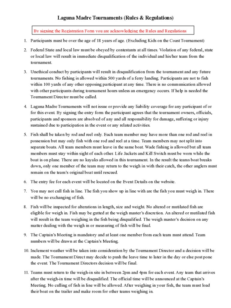 Laguna Made Tournaments (Rules & Regulations By signing the Registration Form you are acknowledging the Rules and Regulations 1. Participants must be over the age of 18 years of age. (Excluding Kids