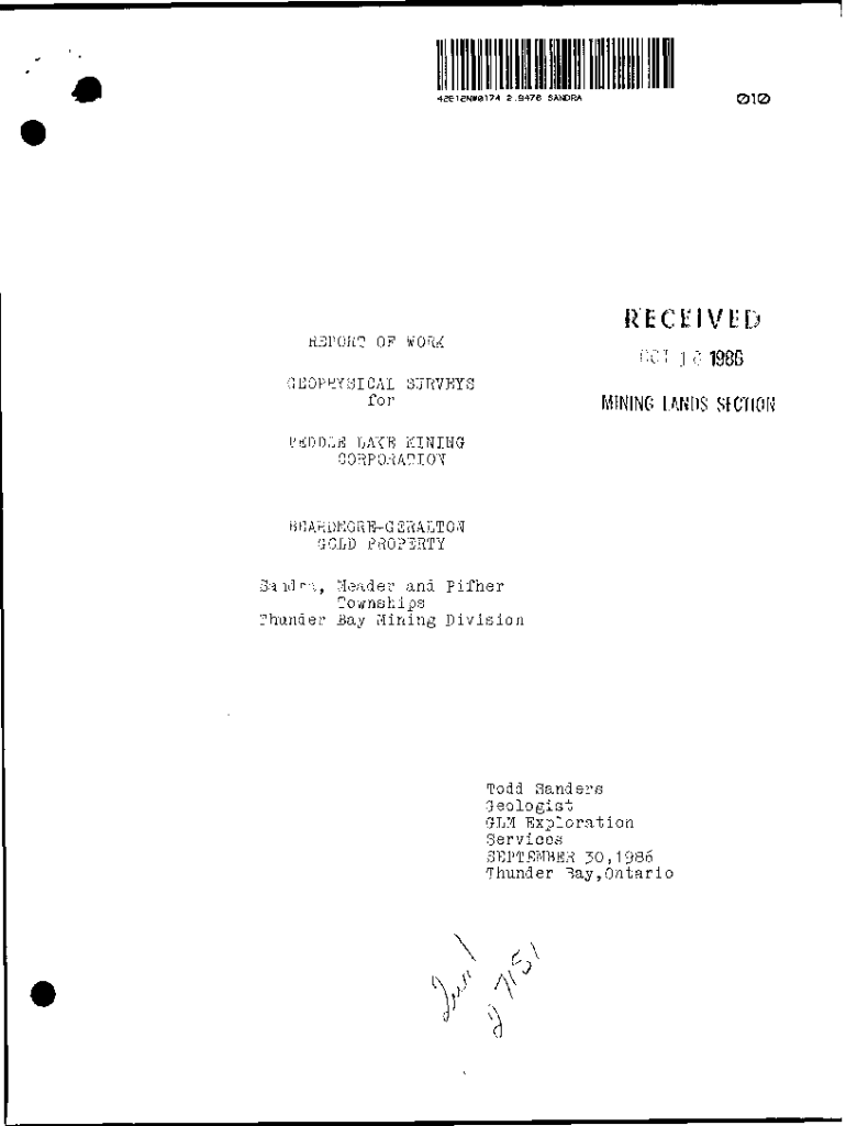 A.9476 SANDRA010RECEIVED REPORT OP WORK\'.\'i J O 1986GEOP FFF SI CAL SURVEYSforMINING LANDS SICTIONPEDDLE LAKE MINING CORPORATIONBEARDMOREGERALTON GOLD PROPERTYSaadm, Leader and Either Townships