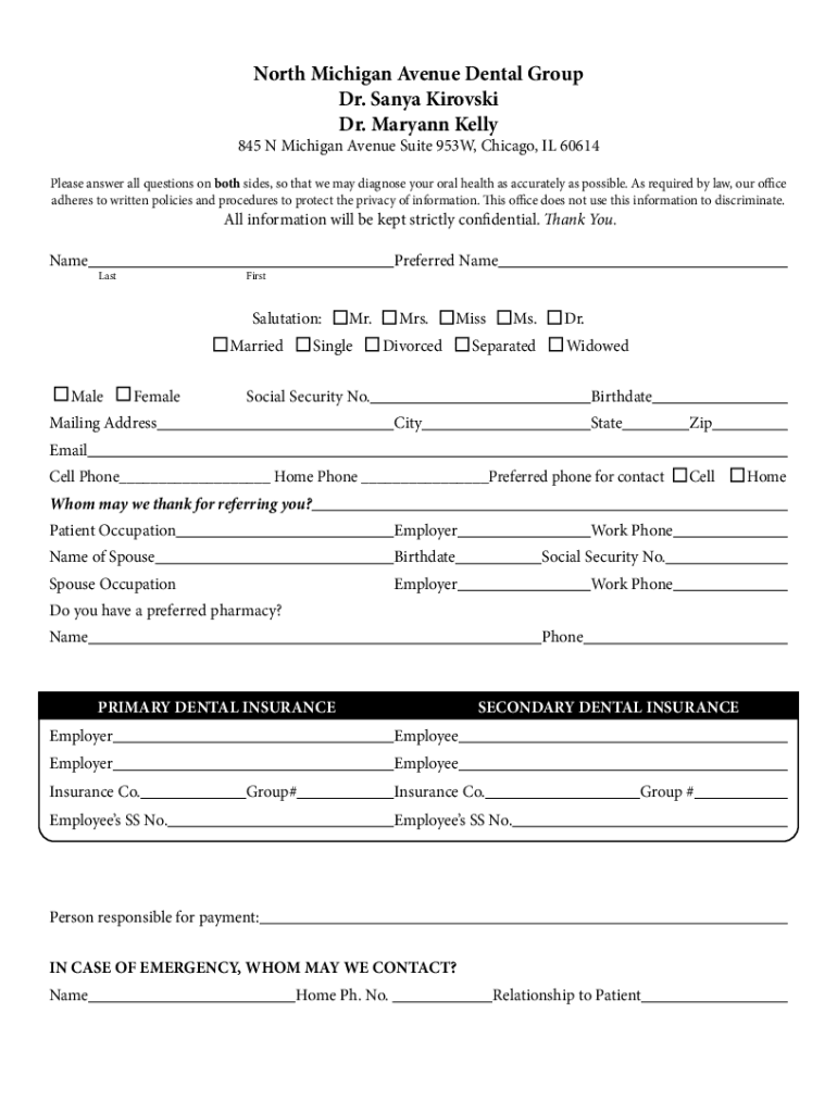 North Michigan Avenue Dental Group Dr. Santa Kirov ski Dr. Maryann Kelly845 N Michigan Avenue Suite 953W, Chicago, IL 60614 Please answer all questions on both sides, so that we may diagnose your
