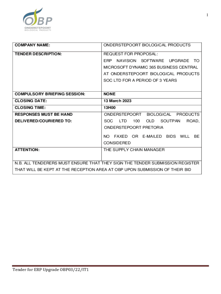 1COMPANY NAME:ONDERSTEPOORT BIOLOGICAL PRODUCTSTENDER DESCRIPTION:REQUEST FOR PROPOSAL: