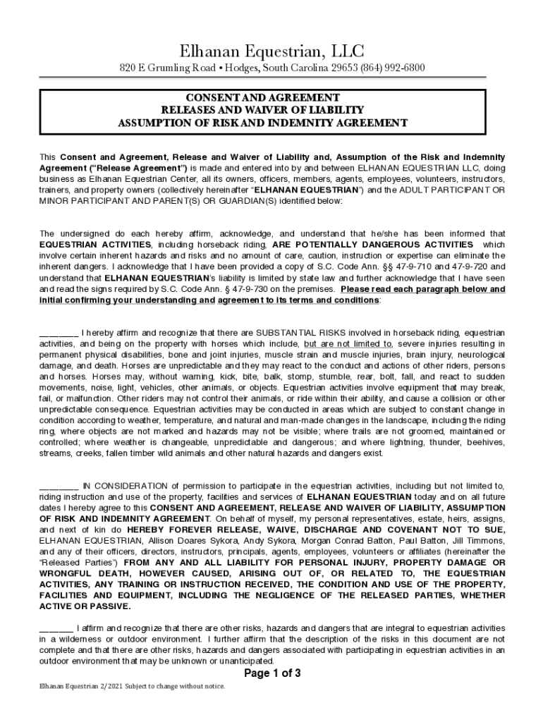 Eltanin Equestrian, LLC 820 E Grueling Road Hodges, South Carolina 29653 (864) 9926800 CONSENT AND AGREEMENT RELEASES AND WAIVER OF LIABILITY ASSUMPTION OF RISK AND INDEMNITY Agreements Consent and
