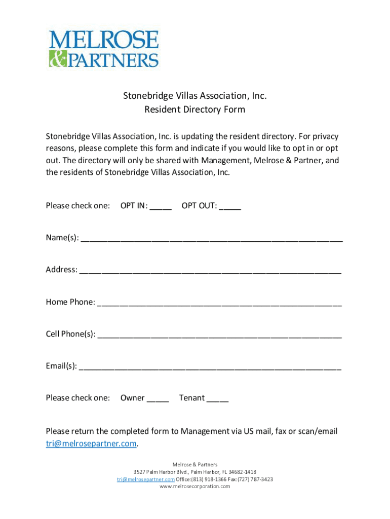 Get the free Stonebridge Villas Association, Inc. Resident Directory Form